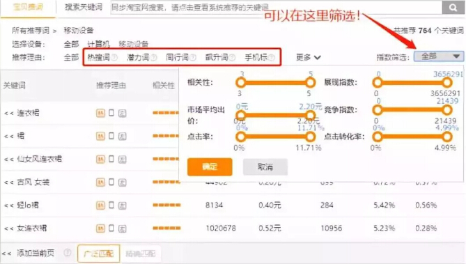 一般来说建议大家把钱都花在二级词上,例如说外套、连衣裙,都是一级大词,那么二级词就是还有一些属性的词、衍生词,比如说雪纺连衣裙、学生西装外套,因为一级词流量大但是转化低,二级词的转化一般来说比较高,流量也还可以,用直通车也比较好带动。
