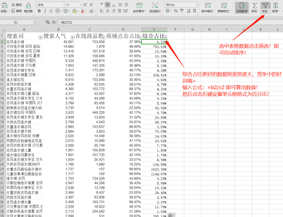 因为我们要找搜索热度高,在线商品少的词!c店要尽量选取商城点击占比50%以下的相关关键词,因为数据显示此时50%以上都进了天猫店,那么你选择他只会竞争更加的激烈!
