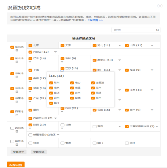 除港澳台、海外,其他通投;对于偏远地区可以根据个人情况选择性投放,快递无法到达,可不投;  部分行业可针对产品特性,所销售的宝贝是当地的特色,可不投放,如福建的鞋业,温州的皮具等;  季节、气候产品,针对性的投放地域,如冬季的棉服,可针对北方较冷的气候投放会更精准需求。