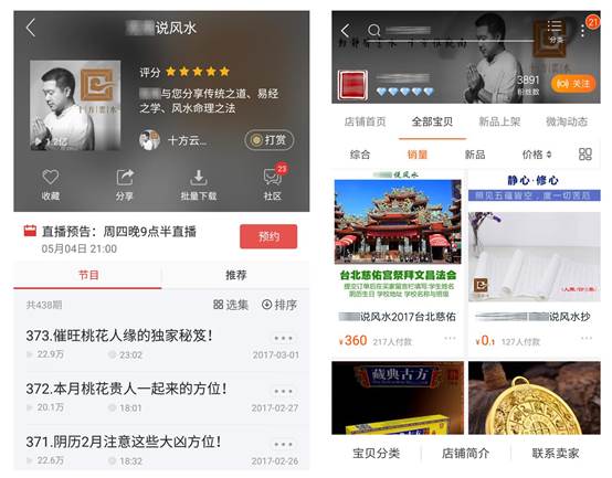 比如这位风水先生,我们抛开风水可不可信这个话题不谈,但不得不承认确实有一群人是相信风水文化的。这位风水界的网红利用音频平台进行内容分享,同时植入营销活动及产品,导入到淘宝店铺形成商业转化的闭环。
