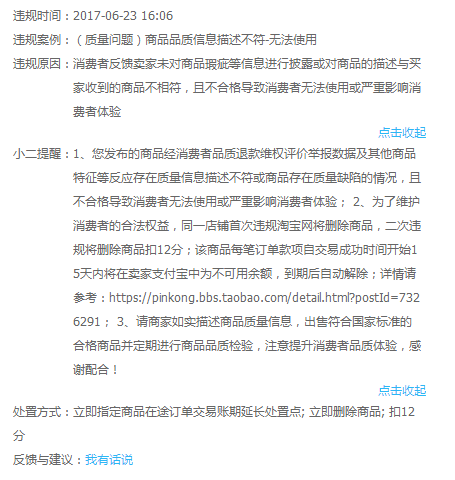 因此如果有店铺第一次出现此种情况,如果无法确保整个页面都整改正确,建议先直接下架此款宝贝。