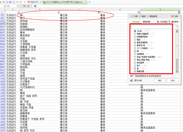 当然还一个方法就是利用提高质量分来降低平均点击花费,但是我们能控制的是它的相关性和创意质量。相关性我之前写过图文怎么去解决相关性的问题,无非是查看宝贝类目和关键词是否是相符的,当然我们用宝贝推词的时候就能看到相关性,选相关性高的词去添加是最好的,如果觉得词不够,可以去下载top20W词表,我们点击筛选按钮。选择自己宝贝本身的一级类目和二级类目再选符合的关键词。再添加会相关性方面很高,质量分不会太低。